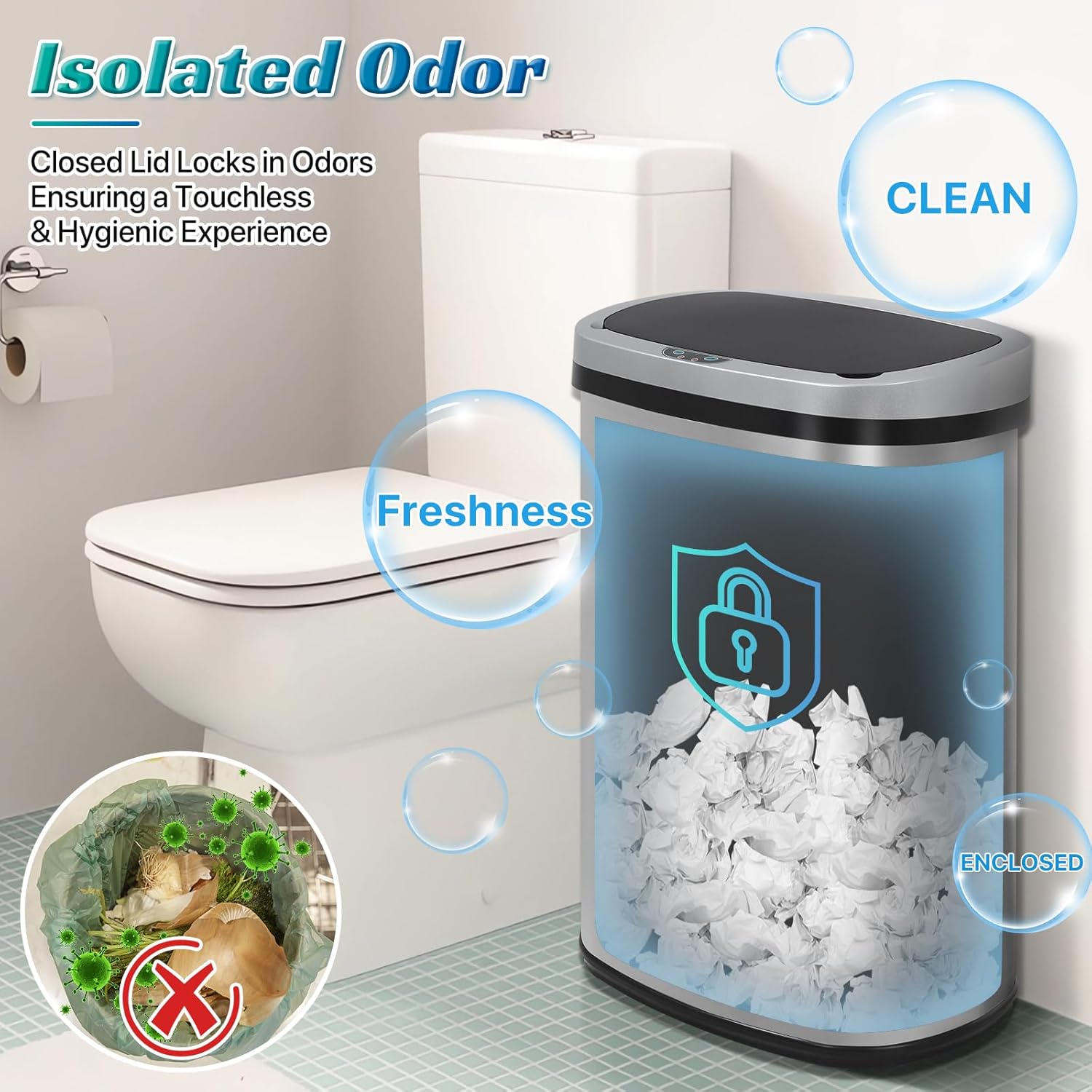 The lid seals automatically, prevents flies from flying in and isolates odours, keeping your space always fresh.