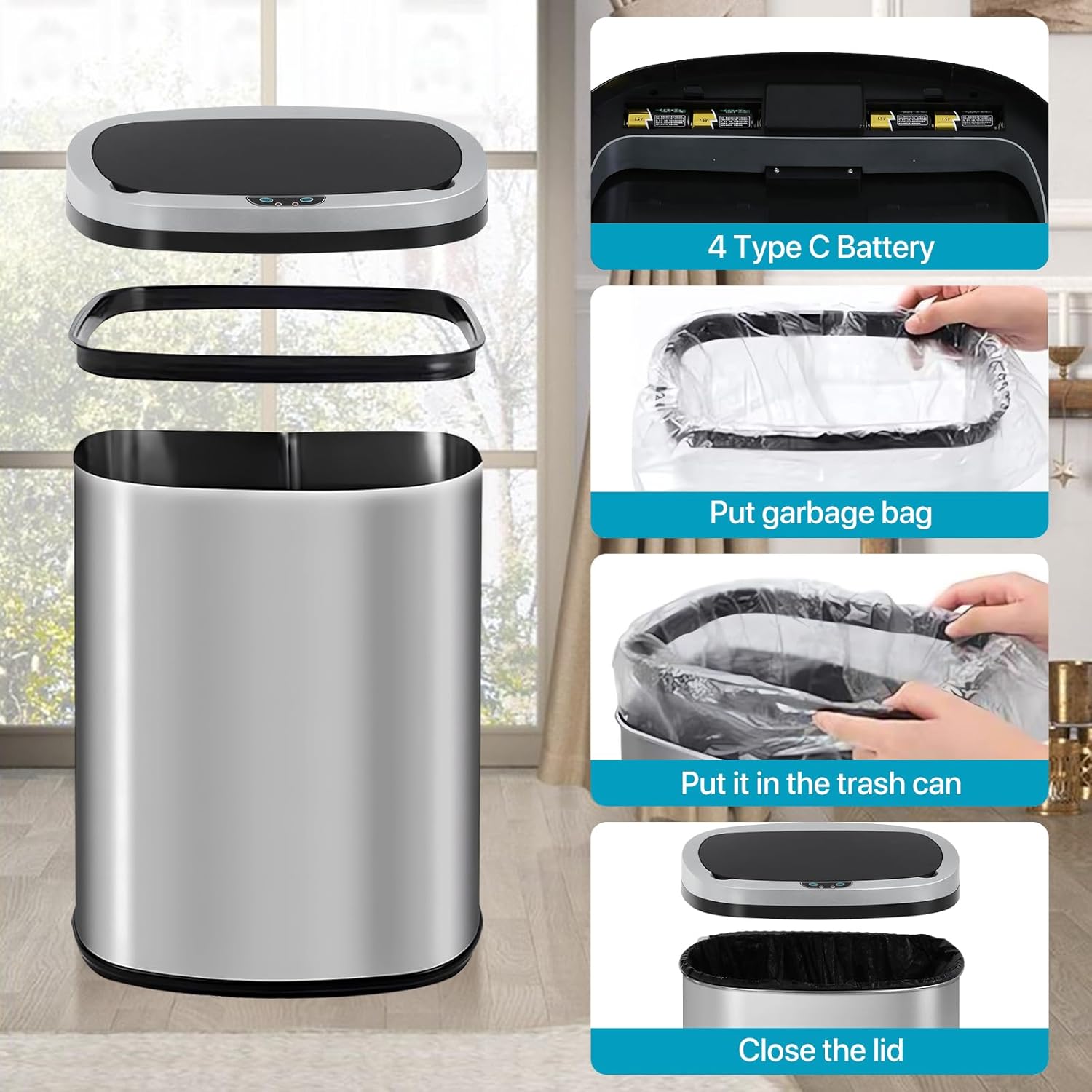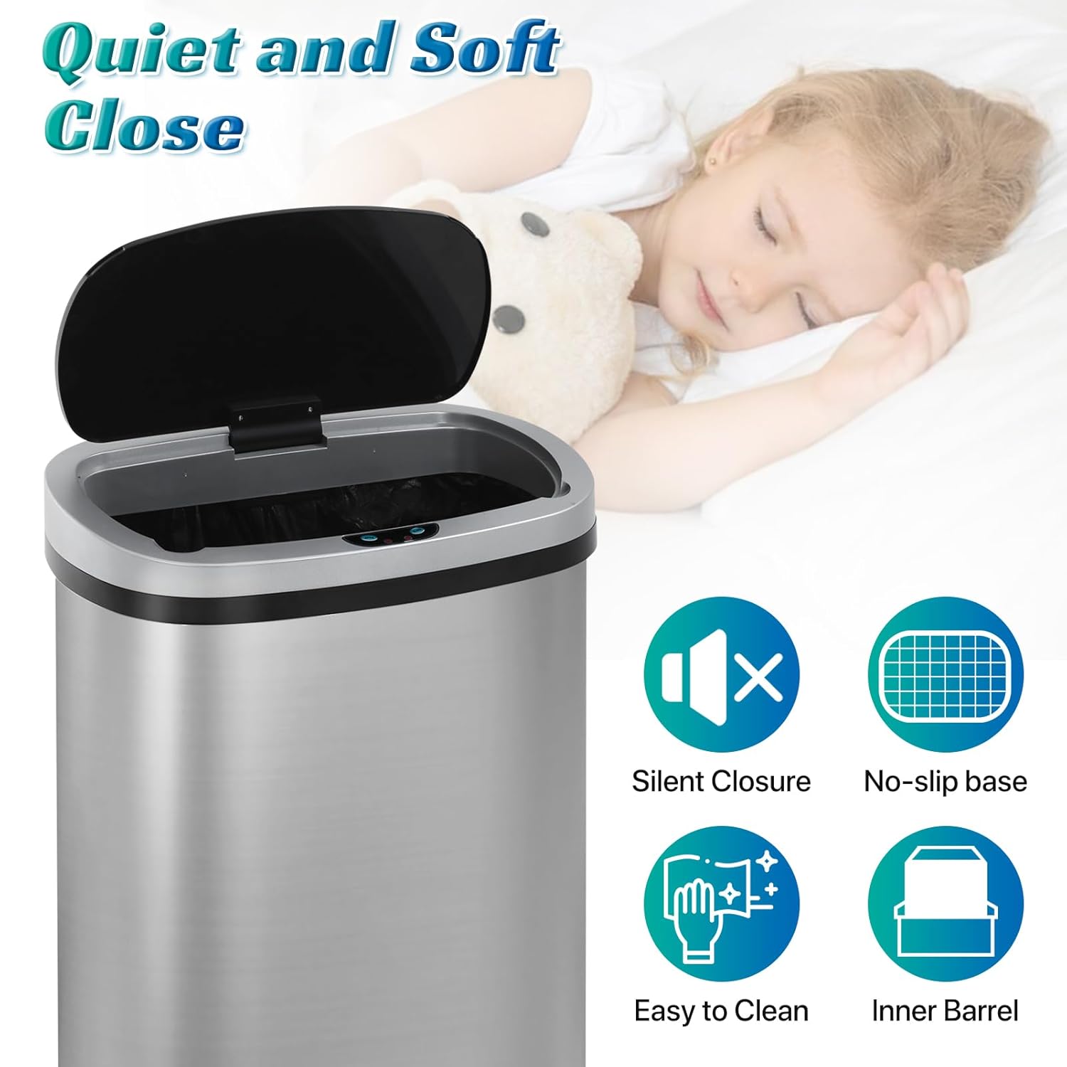 Our touch-free trash bin uses slow down technology, Lid is very smooth and quiet when it opens and closes, you can rest assured that you can use, do not worry about disturbing the rest of the family.